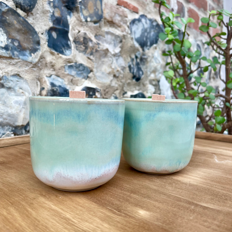 This hand-thrown coffee cup in a soft Mint Breeze glaze is first filled with an unscented candle, allowing you to enjoy it both as a candle and later as a reusable mug. Once the wax is finished, simply clean it out and use it for your favourite hot drinks. The smooth glazed surface and practical size make it perfect for everyday use, whether it’s on your desk, bedside table or in the kitchen.
